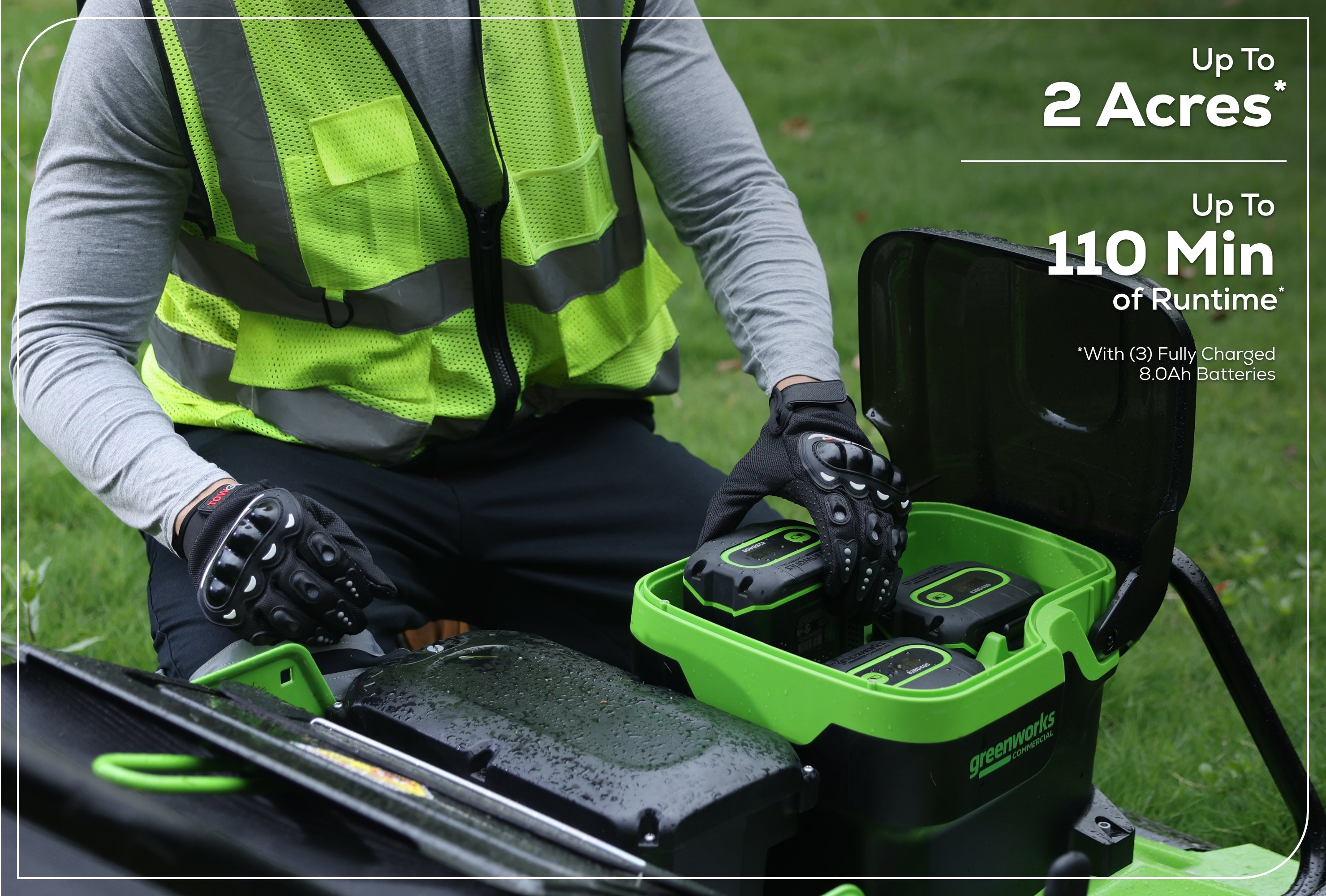 Runtime of up 110 minutes and coverage of up to 8000m2 is a sure thing with a Triple Port powerhead holding up to 3 x 7.2Ah batteries to deliver the best-in-class runtime.